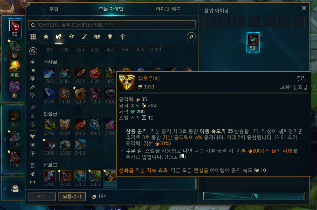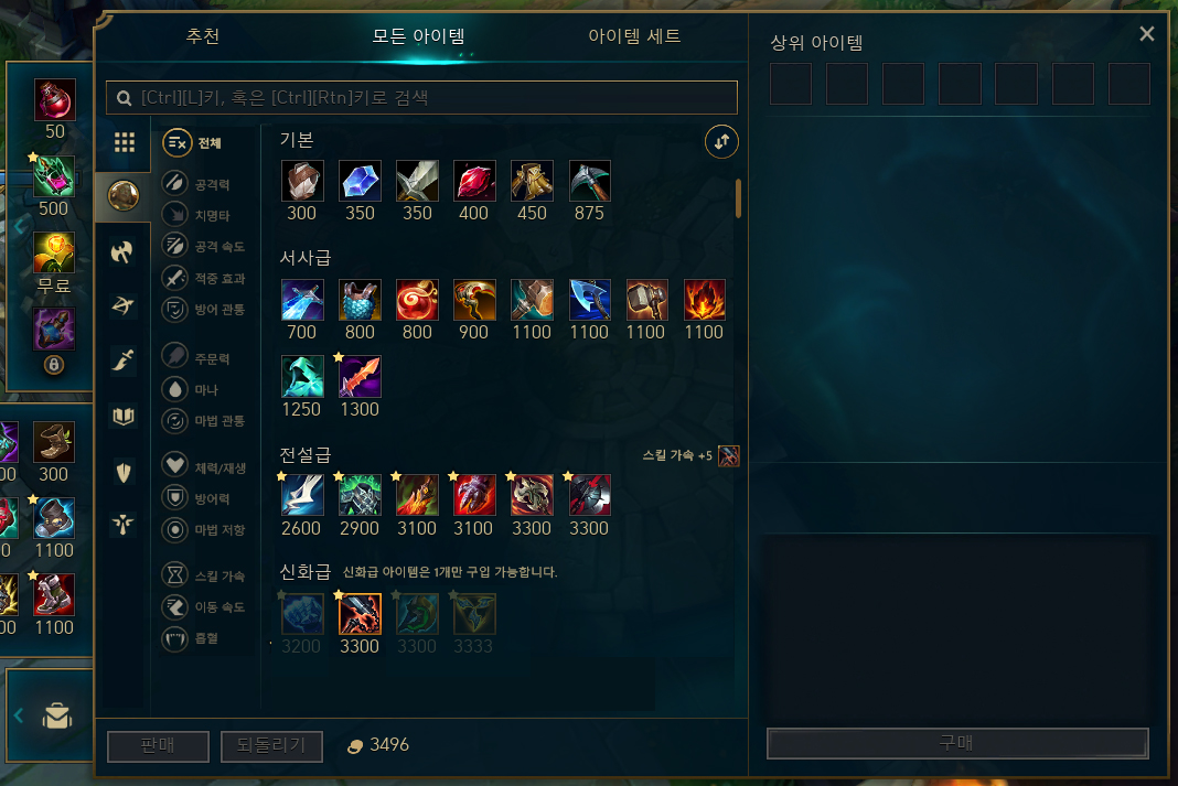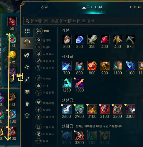 여기서 중요한 것은 신화급 아이템은 단 하나만 구입 가능하다는 것입니다.