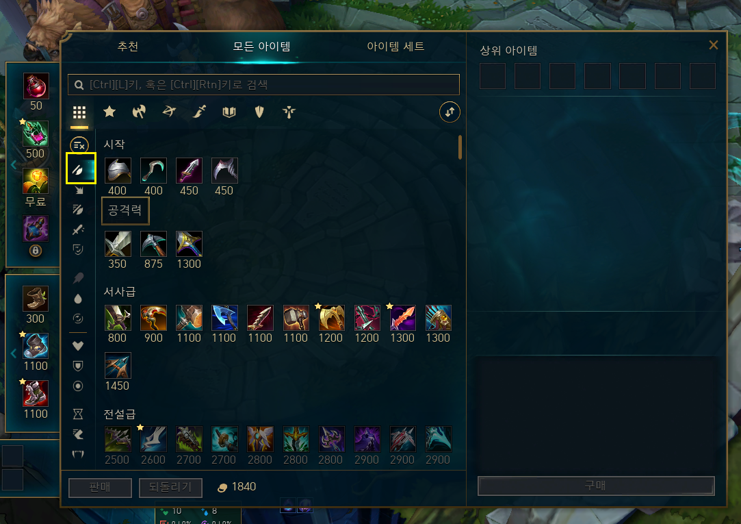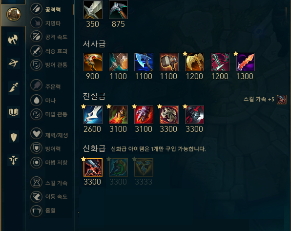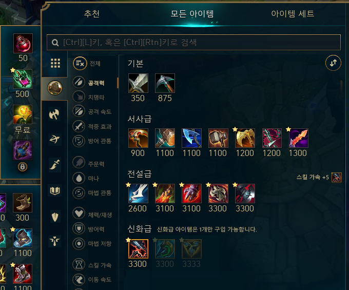 짜잔! 아래 사진처럼 공격력과 공속을 모두 가진 템을 보여줍니다.