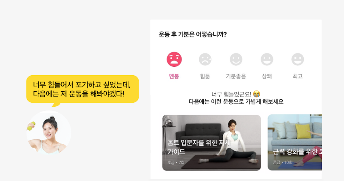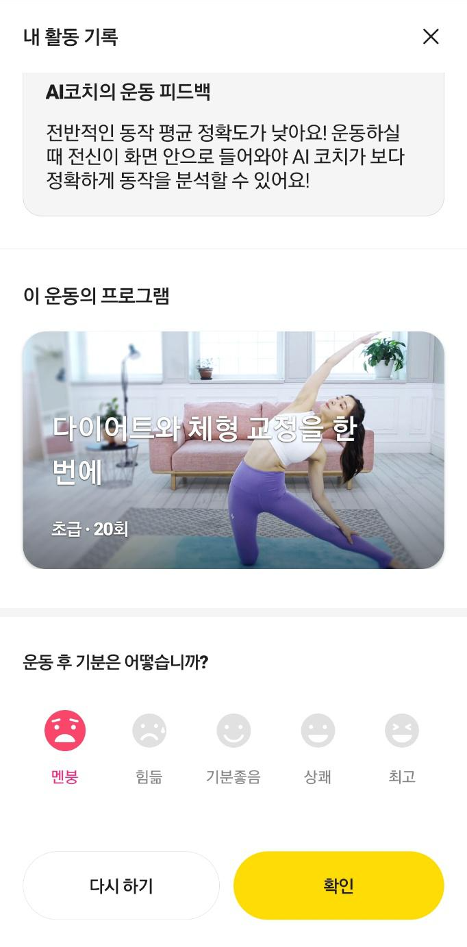 그에 따라서 멘붕을 선택한 유저에게는 보다 쉬운 자세나 운동을 추천함으로써 운동의지를 계속 유지할 수 있게 도와줍니다!