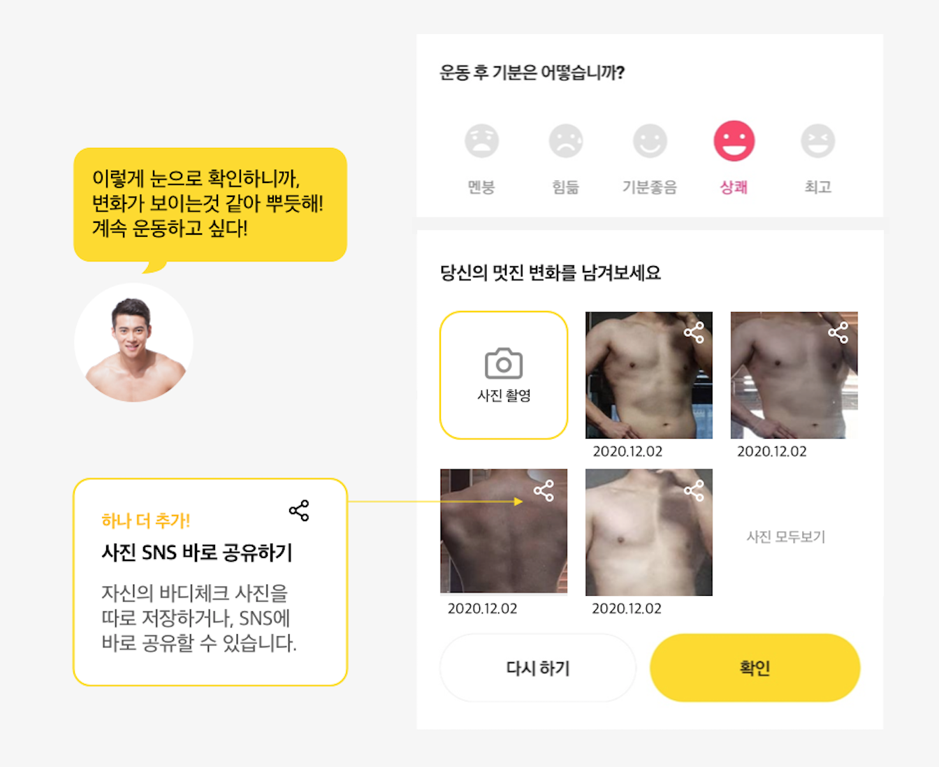 이러한 사용자의 경험을 서비스에 녹아내여, 바디체크 기능을 통해 운동 완료 후에 사진을 찍어 기록할 수 있게 디자인해봤습니다.