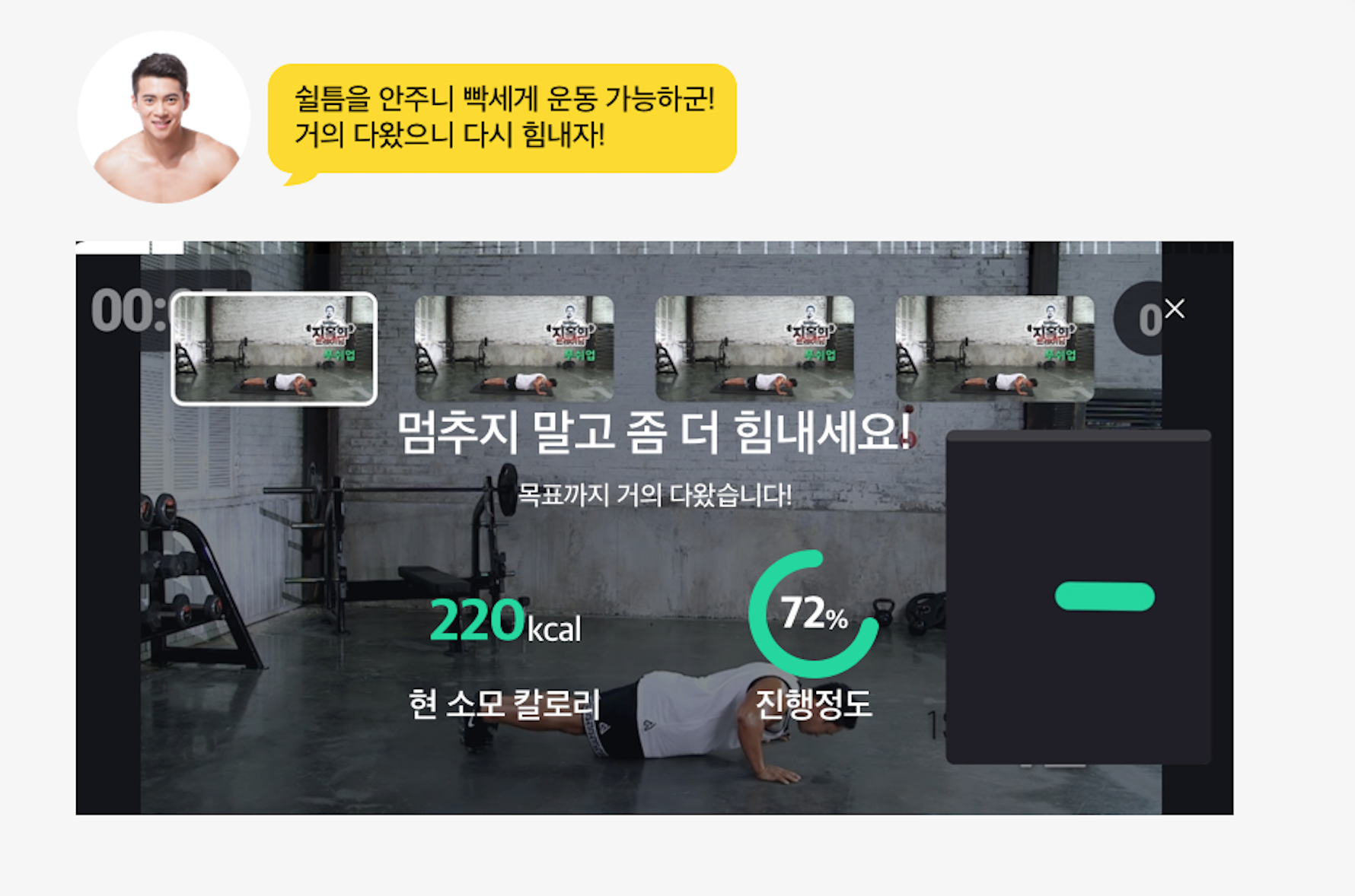 영상이 자동으로 일시 정지되고 현재 상황과 소모 칼로리를 보여줍니다. 그리고 마이크로 카피까지 더해서