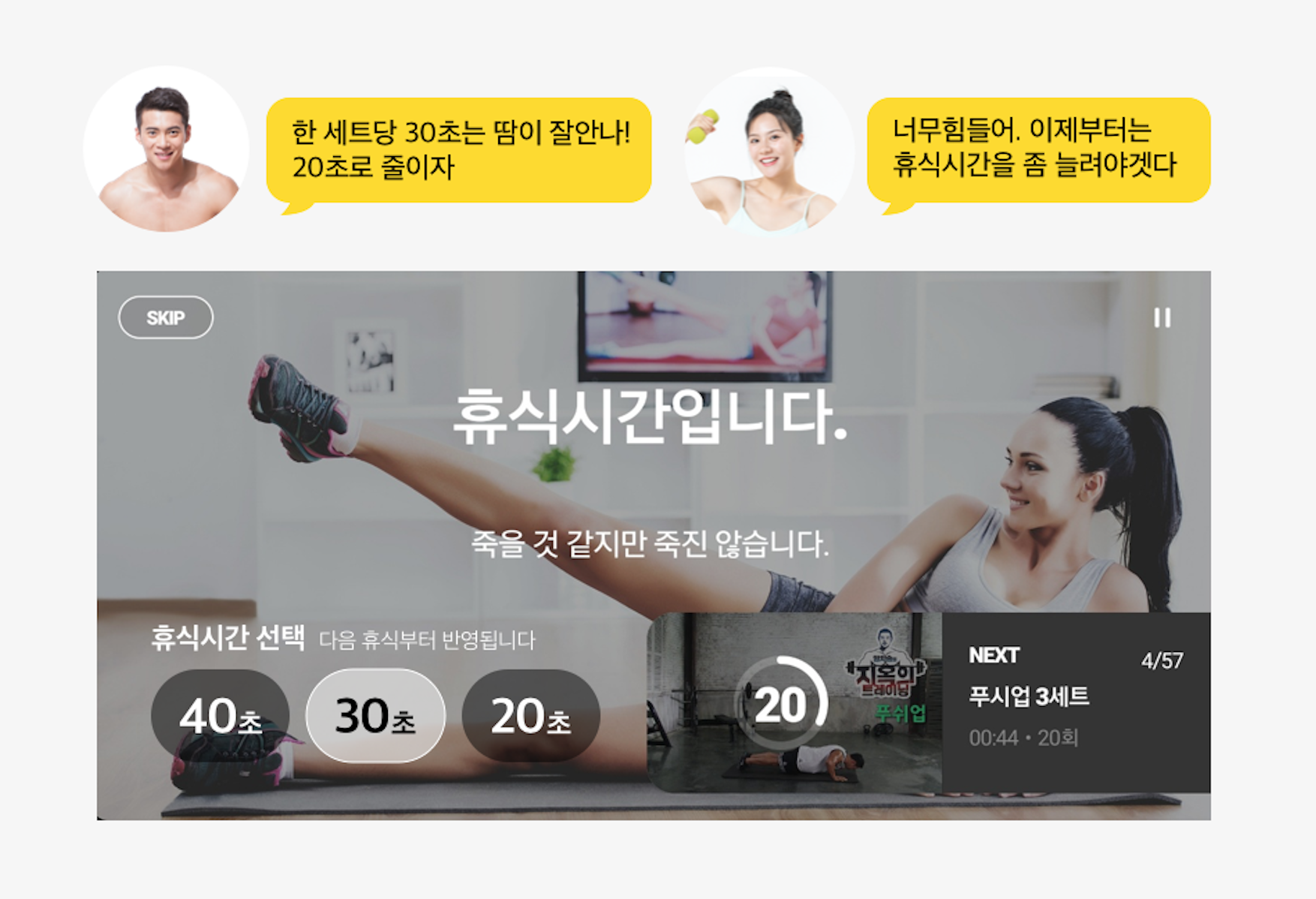 운동이 힘든 사람들은 휴식시간은 40초로 늘릴 수 있고,